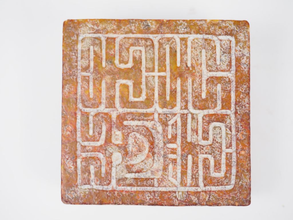 Sceau en serpentine, à décor d'un dragon lové et de masques de Taotie. Chine, XXème siècle. 9,5 x 9,5 cm