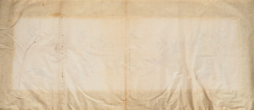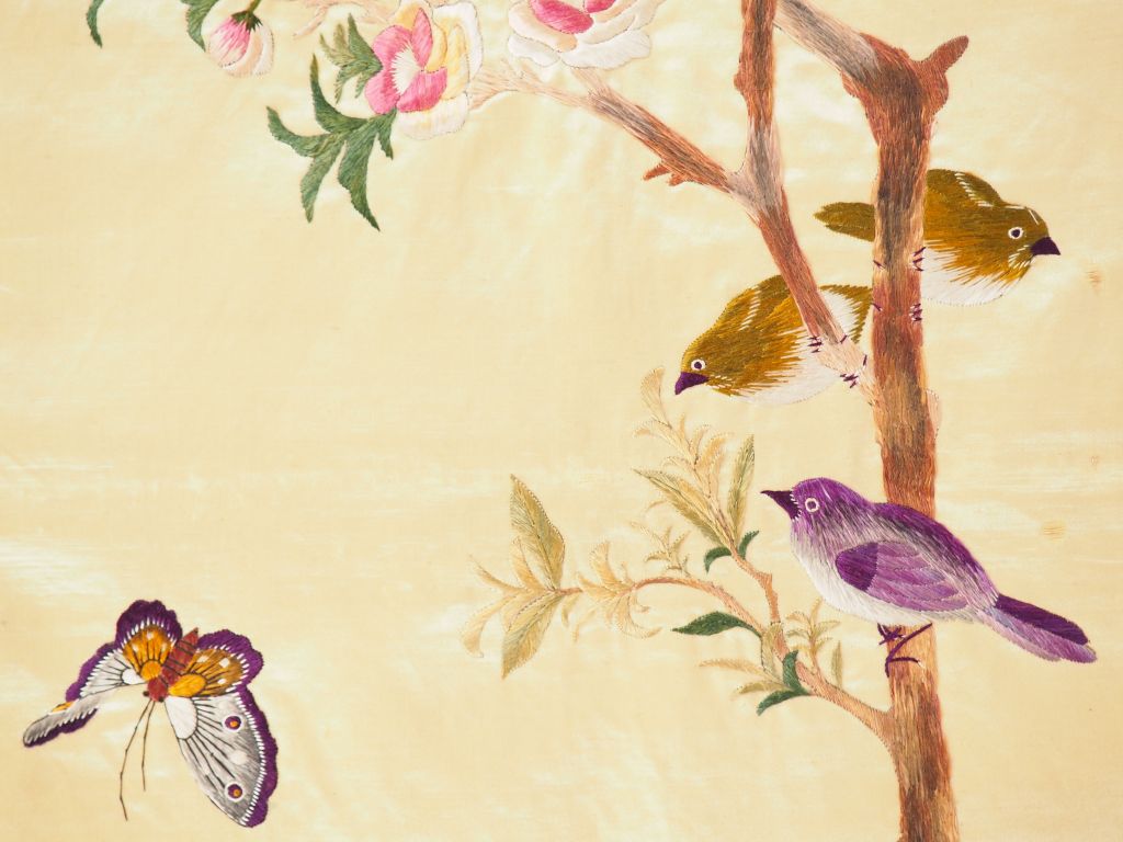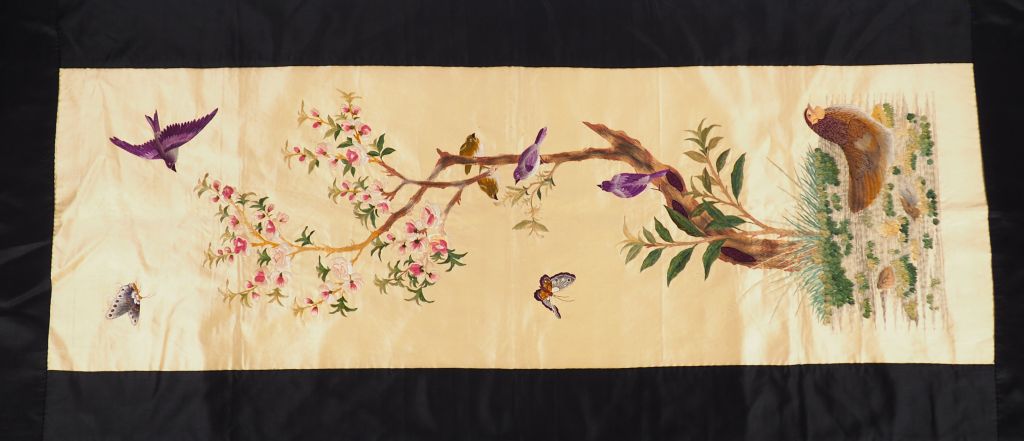 Soie brodée figurant des oiseaux, poules, poussins près d'un magnolia. Indochine, Xxème siècle. Dim. 117 x 39 cm.