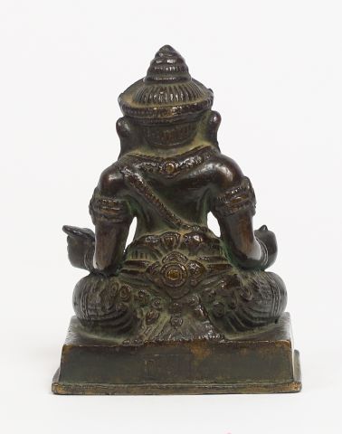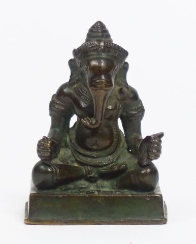 Statuette en bronze à patine brune représentant Ganesh assis (légère occidation). Inde fin XIXème. H. 9,5 cm