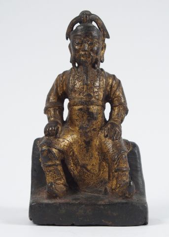 Statuette en bronze laqué et doré représentant Guandi en armure, assis sur un rocher. Chine XVIIème siècle, période Ming. H. : 22 cm
