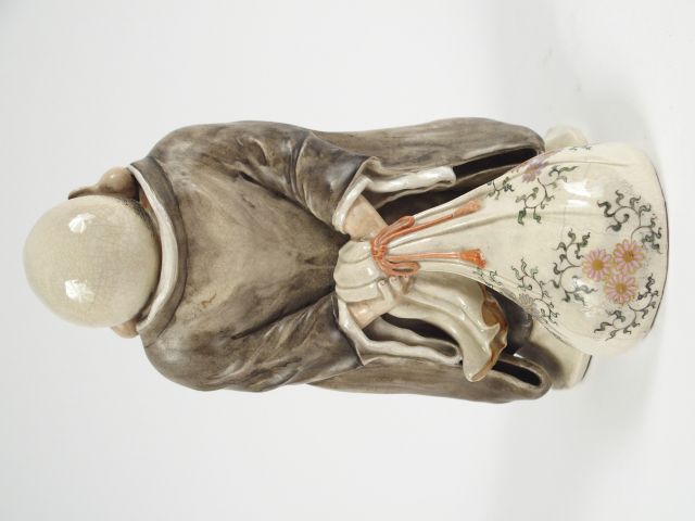Statuette en faïence de statzuma représentant Ohteï debout tenant dans son dos le sac des richesses. Japon, période Meiji. H. : 25,5 cm (fels de cuisson)