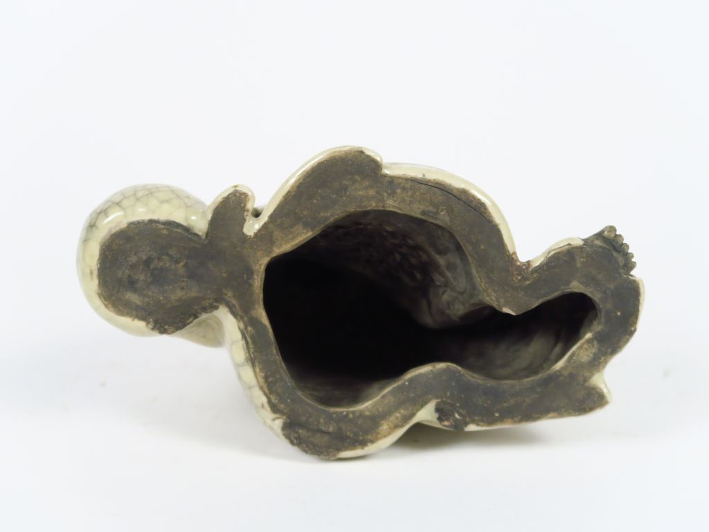 Statuette en grès de Guangdong en porcelaine et émail craquelé céladon représentant Boudaï sur le sac des richesses. Chine fin XIXème. H. 17,5 cm