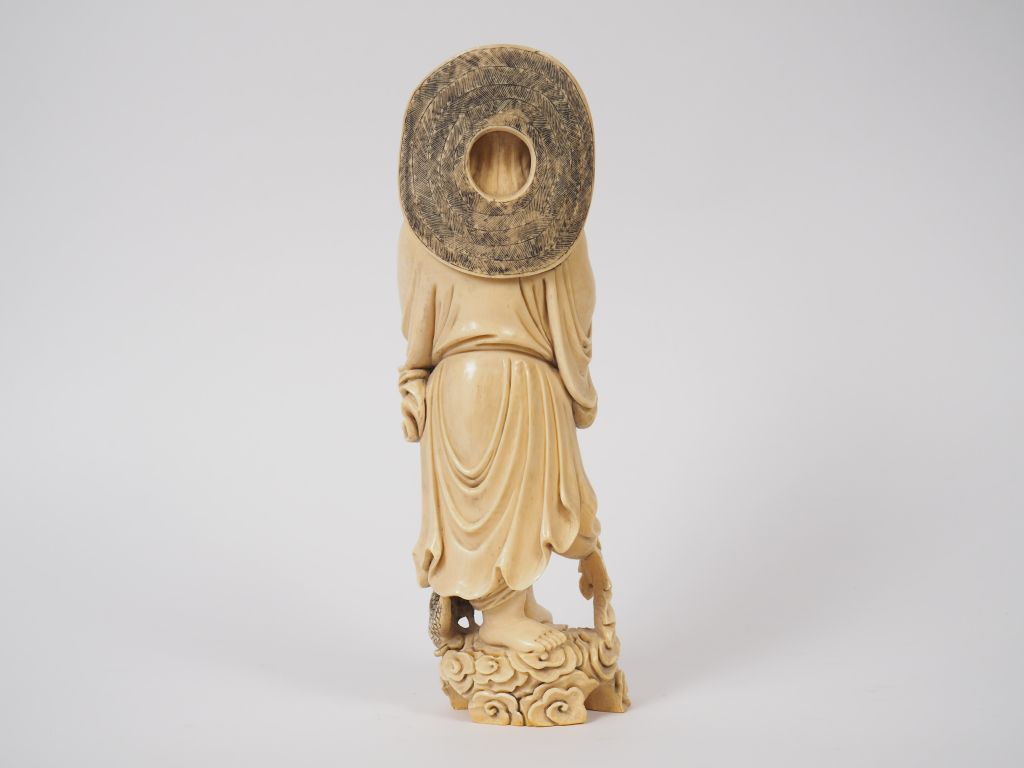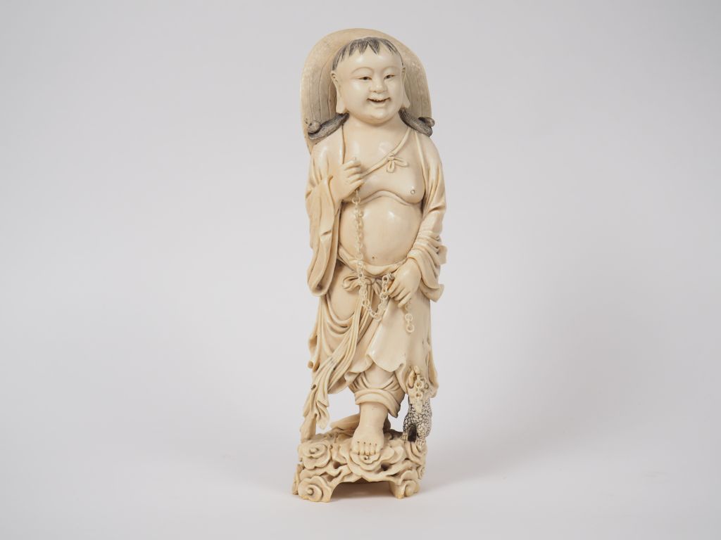 Statuette en ivoire finement sculpté représentant Liu Hai accompagné du crapaud céleste debout sur des nuages stylisés. Chine, vers 1930. H. 34,5 cm Poids. 2202 g (petit manque à une chaine) Nom scientifique de l’ivoire : ivoire d’éléphant Elephantidae spp (I/A, pré-convention), spécimen antérieur au 1er juin 1947 et conforme à la réglementation CE 338/97 du 09/12/1996, art. 2-W mc. Pour une sortie de L’UE, un CITES de ré-export sera nécessaire, celui-ci étant à la charge de l’acquéreur.
