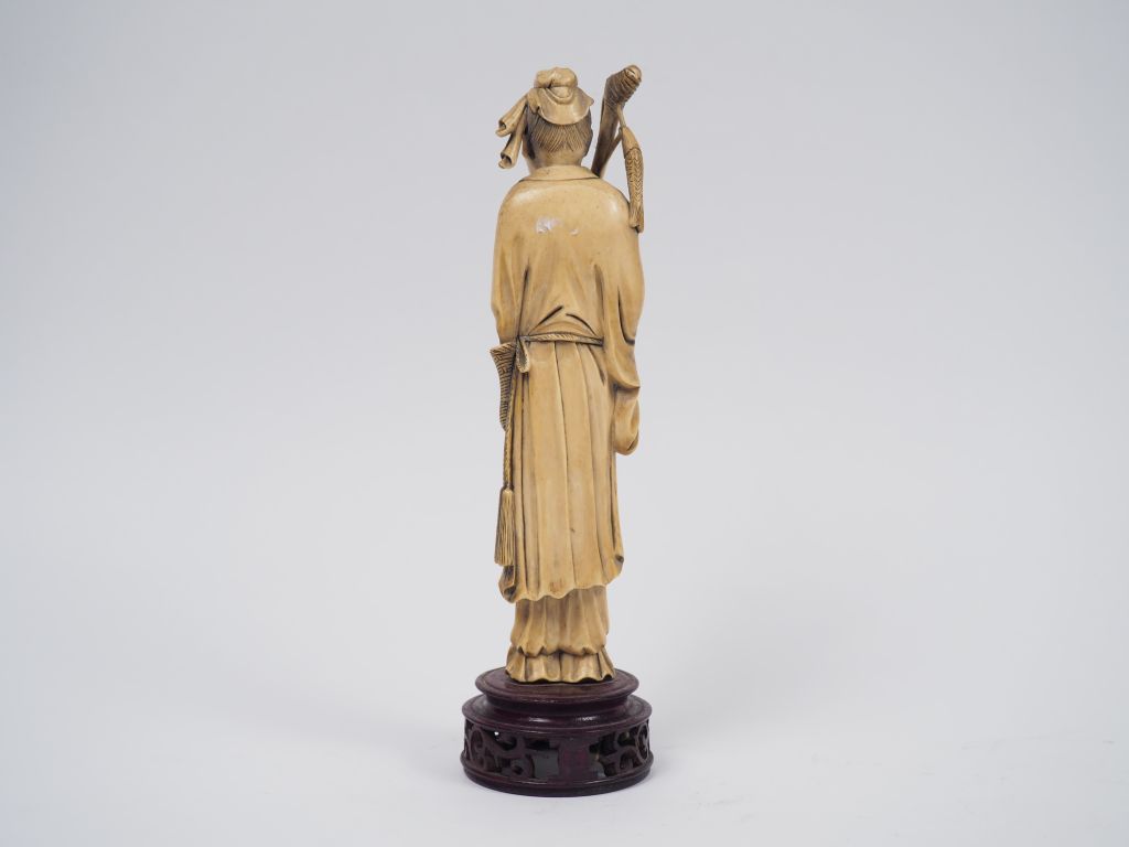 Statuette en ivoire représentant un pêcheur tenant un bambou auquel est accroché un poisson. Chine, vers 1930. H. 24 cm Poids tel avec le socle. 404 g Nom scientifique de l’ivoire : ivoire d’éléphant Elephantidae spp (I/A, pré-convention), spécimen antérieur au 1er juin 1947 et conforme à la réglementation CE 338/97 du 09/12/1996, art. 2-W mc. Pour une sortie de L’UE, un CITES de ré-export sera nécessaire, celui-ci étant à la charge de l’acquéreur.