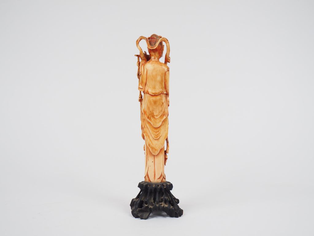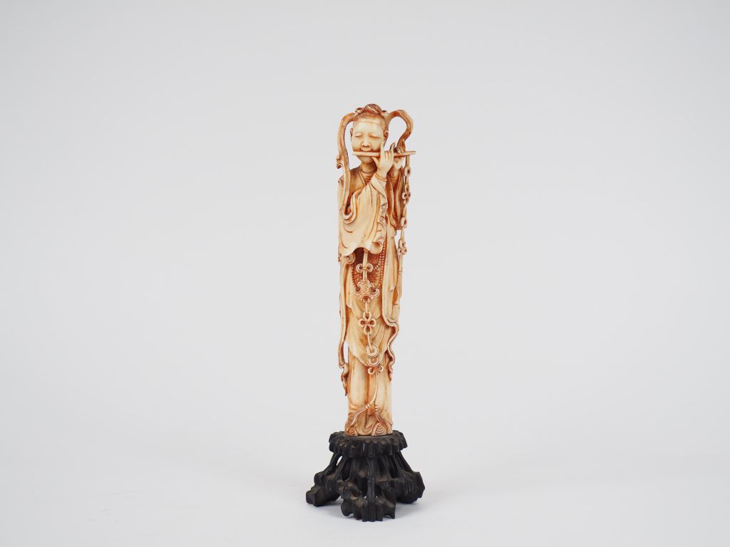 Statuette en ivoire représentant une jeune femme jouant de la flute, son costume et son instrument de musique décorés de pendeloques. Chine, vers 1920. Poids. avec le socle : 256 g H. 21,5 cm Nom scientifique de l’ivoire : ivoire d’éléphant Elephantidae spp (I/A, pré-convention), spécimen antérieur au 1er juin 1947 et conforme à la réglementation CE 338/97 du 09/12/1996, art. 2-W mc. Pour une sortie de L’UE, un CITES de ré-export sera nécessaire, celui-ci étant à la charge de l’acquéreur.