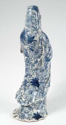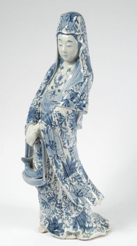Statuette en porcelaine d'Aarita représentant une divinité tenant un panier contenant un poisson. Japon vers 1900-1920. H. : 46 cm