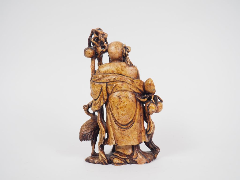 Statuette en stéatite représentant Laotse accompagné d'une grue et tenant la pêche de longévité. Chine, vers 1950. H. 22 cm