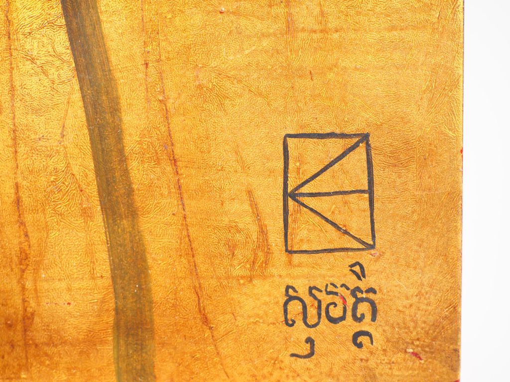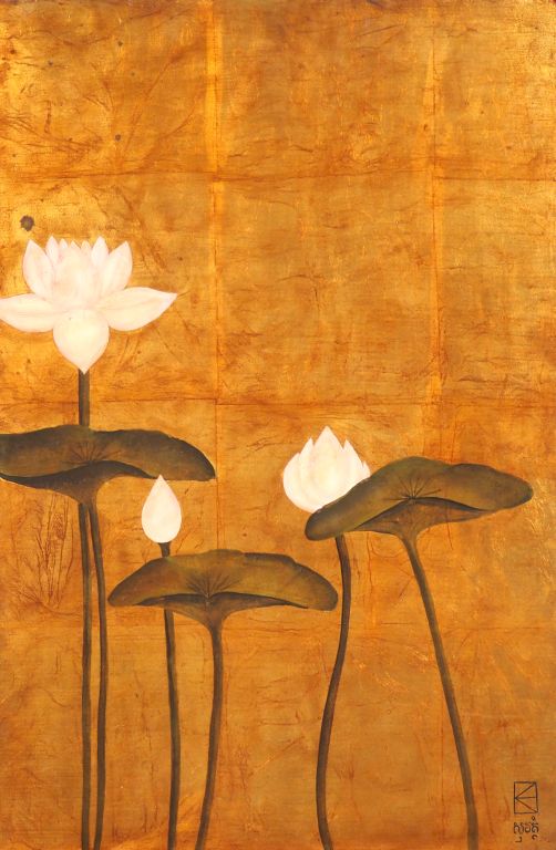 Sud-Est asiatique, XXe siècle, Panneau en laque représentant des fleurs de lotus rose sur un fond or. Signé en sanskrit en bas à droite. Dim. 60 x 40 cm