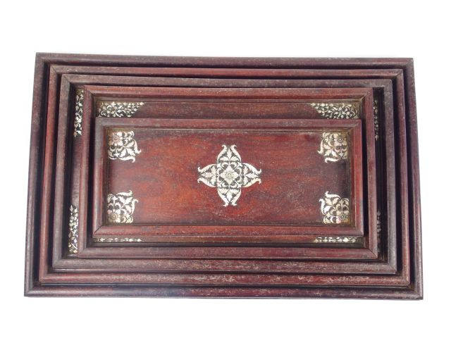 Suite de 5 plateaux gigognes en marqueterie de nacre et bois exotique à décor de feuillage. Indochine