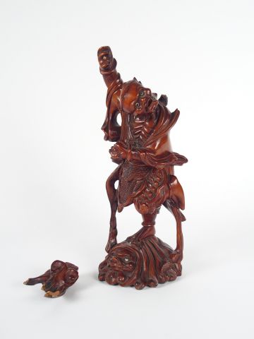 Sujet en bois sculpté représentant l’Immortel Lidieguai, ou Li le Boiteux, debout sur un animal fantastique. Chine. H. 29 cm (manques et accidents)