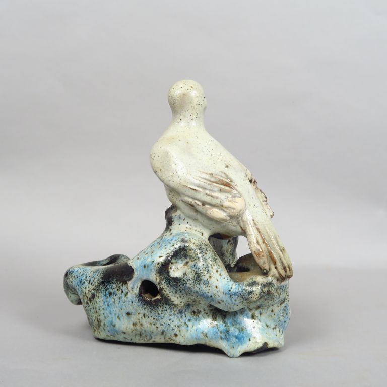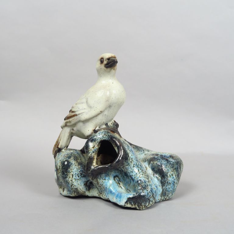 Sujet en céramique et émail bleu lavande représentant une colombe sur un rocher. Chine, XIXème siècle. H. 18,5 cm