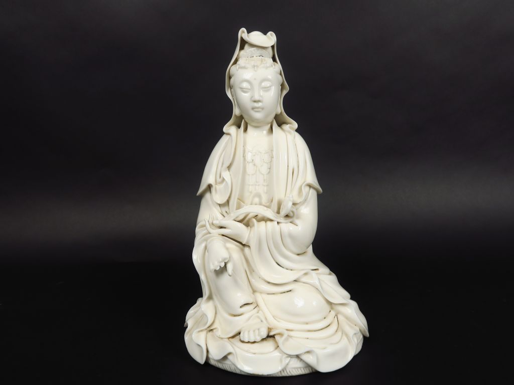 Sujet en porcelaine blanc-de-Chine représentant la déesse Guanyin assise en lalitasana, tenant un sceptre. Marque à la coloquinte. Chine, XIXème siècle. H. 33 cm