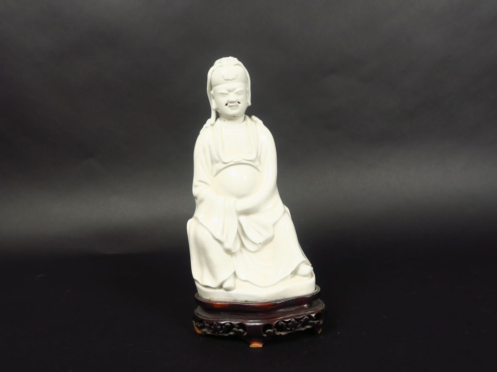 Sujet en porcelaine blanc-de-Chine représentant un dignitaire du Tao, assis. Chine, XIXème siècle. H. 22 cm (Petit manque à la coiffe , manque les moustaches et la barbe rapportés , collé sur un socle en bois)