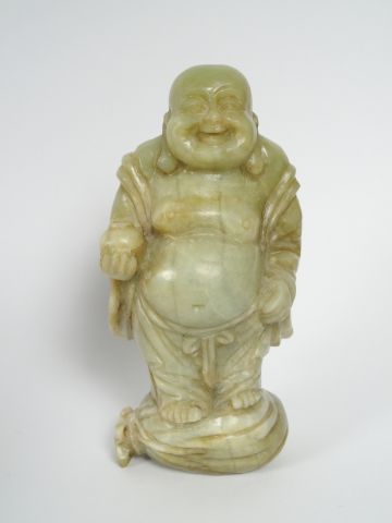 Sujet en stéatite représentant le Boudaï debout, souriant, tenant un bol. Chine. H. 23 cm