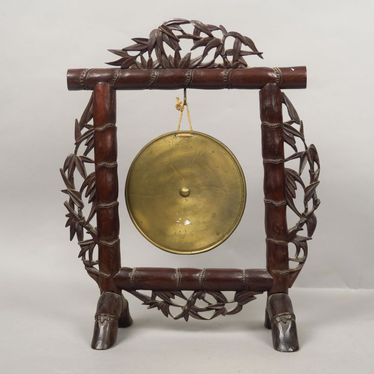 Support de gong en forme de portique, en bois sculpté à l’imitation du bambou, portant un gong en alliage de cuivre. Vietnam, vers 1900. Dim. totale : 36 x 27 cm (petits manques)