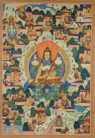 Tanka représentant une lama assis, prise de la terre à témoin entourée de divinités bouddhiques. Tibet, fin XIXe. 65 x 44 cm