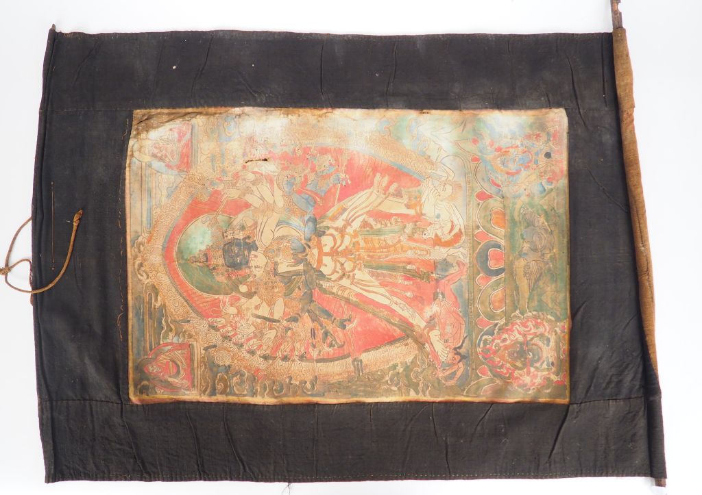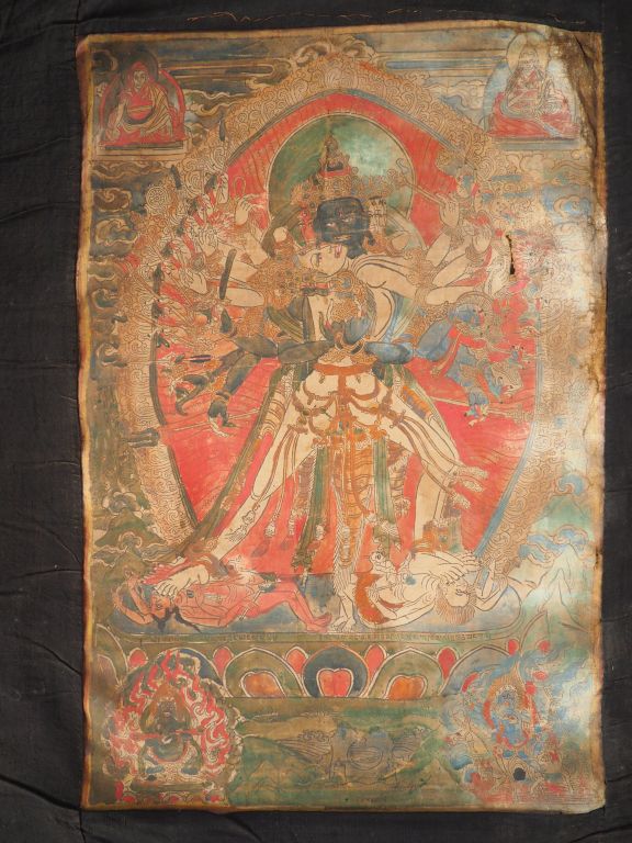 Thangka en polychromie sur toile représentant la divinité tantrique Chakrasamvara, une des divinités tutélaires de Kagyupa. Le dieu est figuré piétinant des démons sur un lotus, en yab-yum avec sa shakti, Vajra-varahi, leurs nombreux bras tenant des attributs. Un stupa dessiné en rouge au revers. Tibet, XIXème siècle. Dim. 60 x 40 cm. (Usures, une déchirure)