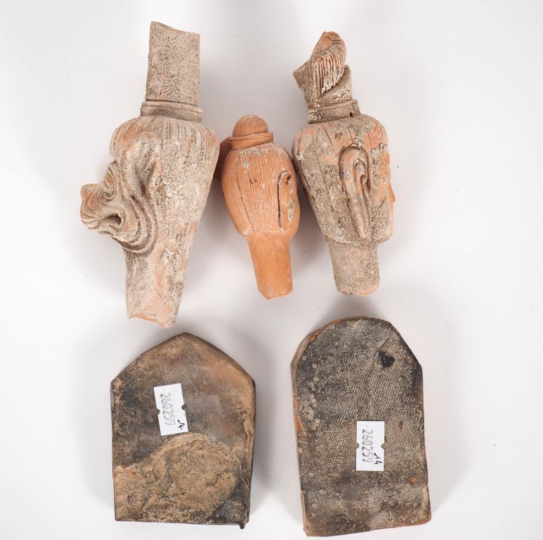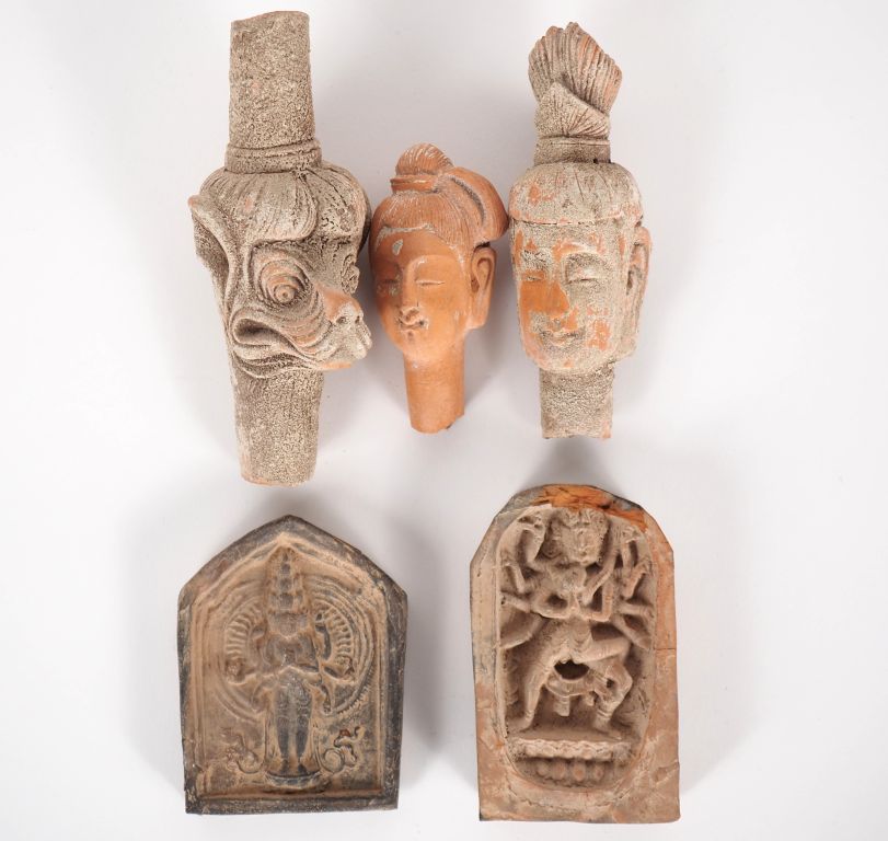 Tibet Ensemble de deux tsatsa représentant Avalokitesvara et Makara avec sa shakti , et trois têtes en terre cuite. H. 8,5 à 12,5 cm