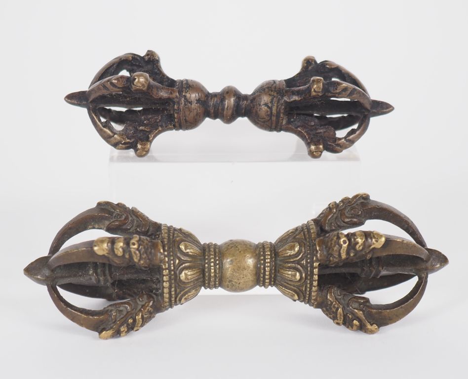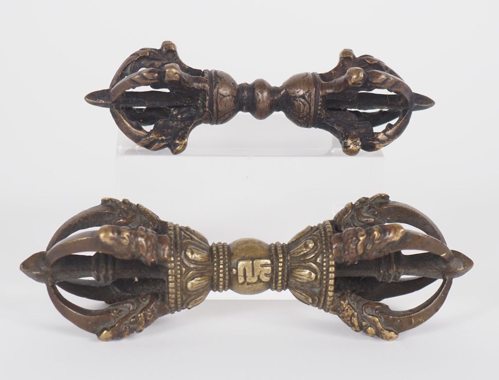 Tibet, XIXe siècle Deux vajra en bronze et laiton, orné de têtes de mahakra, la partie centrale en double lotus. L. 11,5 et 9,4 cm