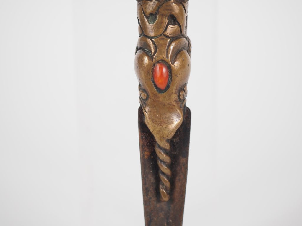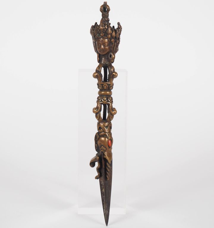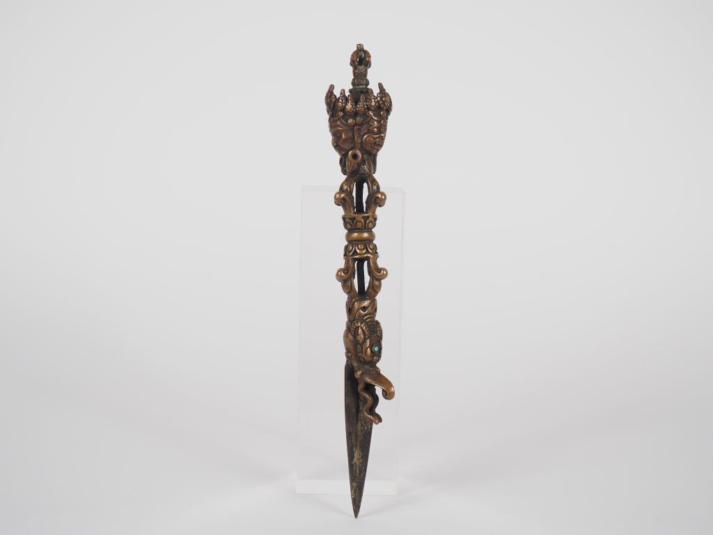 Tibet, XIXe siècle Phurbu en bronze, la prise ornée de trois têtes de divinités, l’une courroucée, surmontées d’un demi-vajra, la lame crachée par un Makara, avec cabochons de turquoise et corail. L. 26 cm