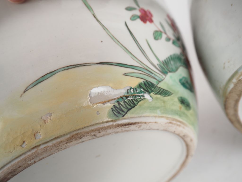 Travail européen, dans le goût chinois Paire de pots à gingembre en porcelaine et émaux de style famille rose, à décor de terrasses arborées, pivoines en fleurs, papillons et guirlandes de ruyi. H. 25,5 cm (Petites égrenures au couvercle de l’un, saut d'émail)
