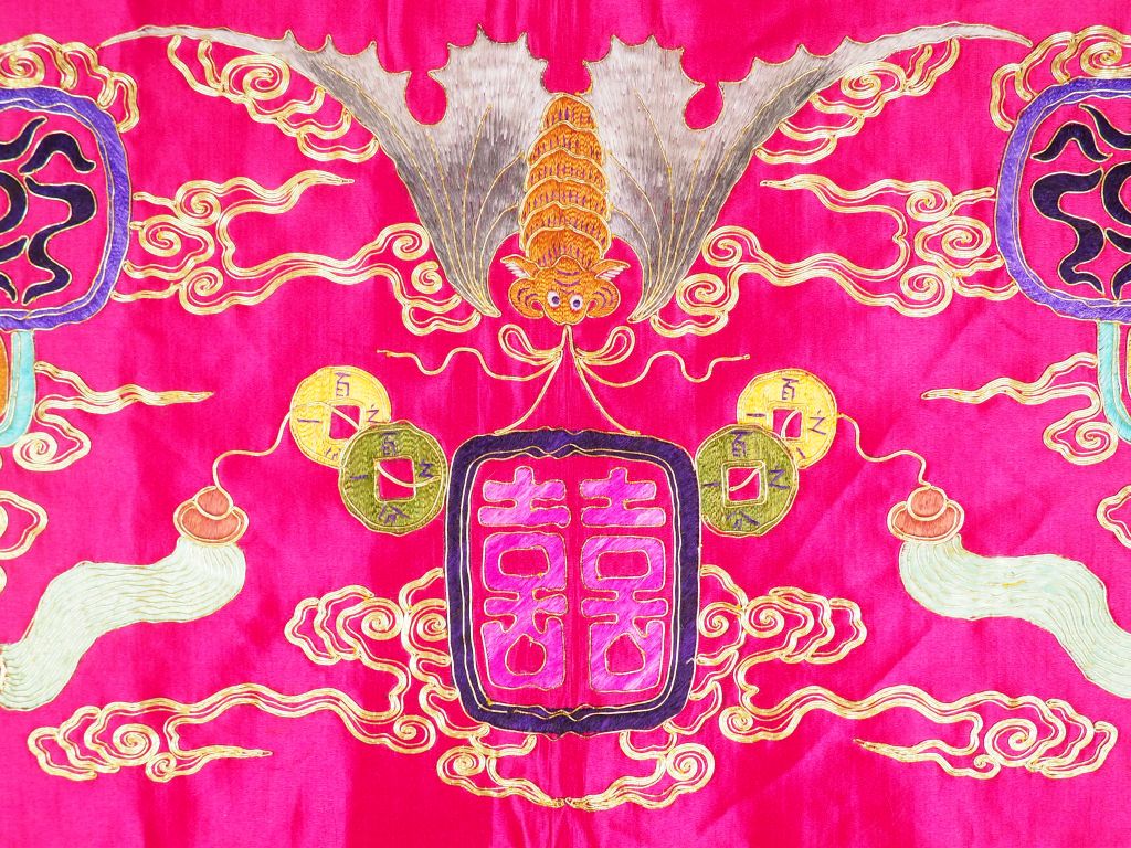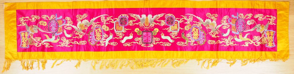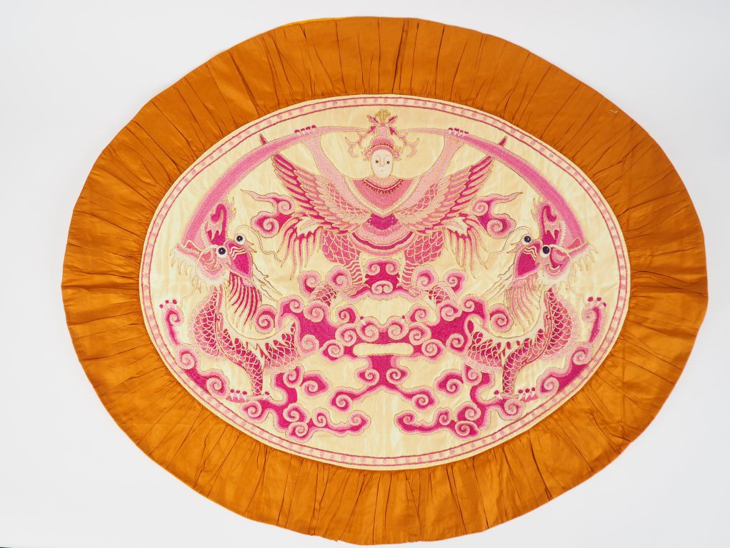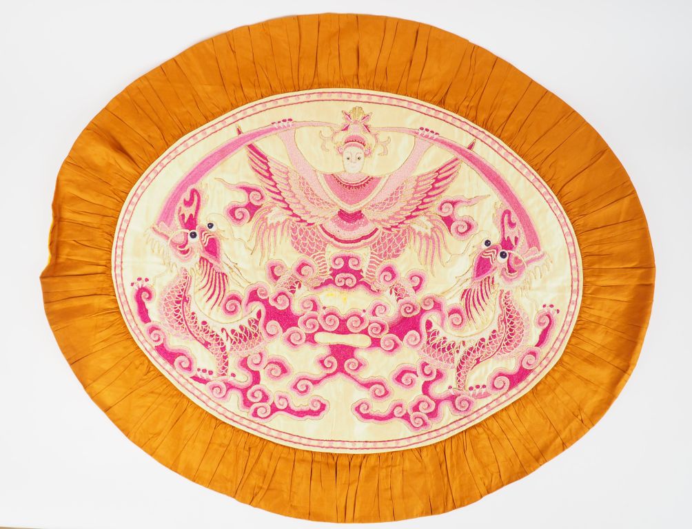 Trois panneaux en soie, dont une paire ovale à fond crème, brodé en camaïeu de fils roses d’une divinité oiseau entourée de deux dragons , entourés d’un large bord en soie marron et doublé de lin jaune , et un long panneau horizontal en soie rouge brodée aux fils polychromes et dorés de caractères auspicieux et chauves-souris parmi des nuages stylisés. Chine, XXème siècle. Dim. parties brodées : 53 x 68 cm – 28,5 x 164 cm.