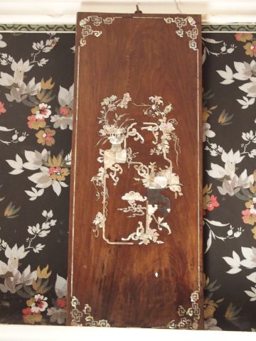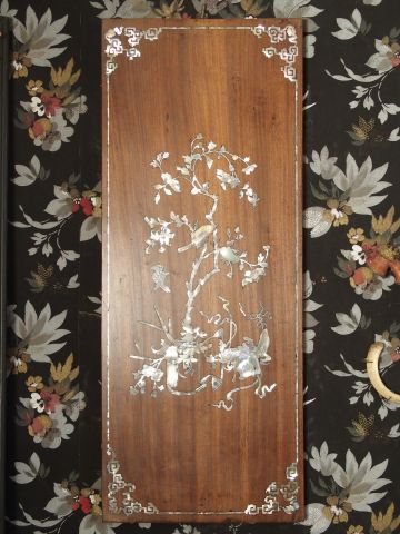 Trois panneaux (petit modèle) en marqueterie de nacre et bois exotique, décor de papillons et de végétaux. Indochine. XIXème