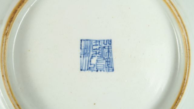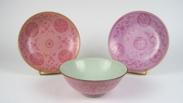 Trois pièces en porcelaine à décor stylisé rouge sur fond rose, porte une marque apocryphe. Chine, XIX ème siècle. Diam. 18,5 à 20 cm
