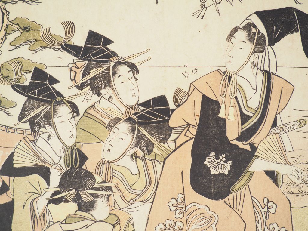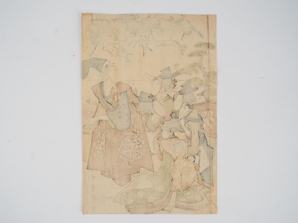 UTAMARO (1753-1806) Estampe oban tate-e, partie de triptyque, groupe de femmes, des grues en vol au-dessus d’elles. (Insolée, rognée, déchirure)