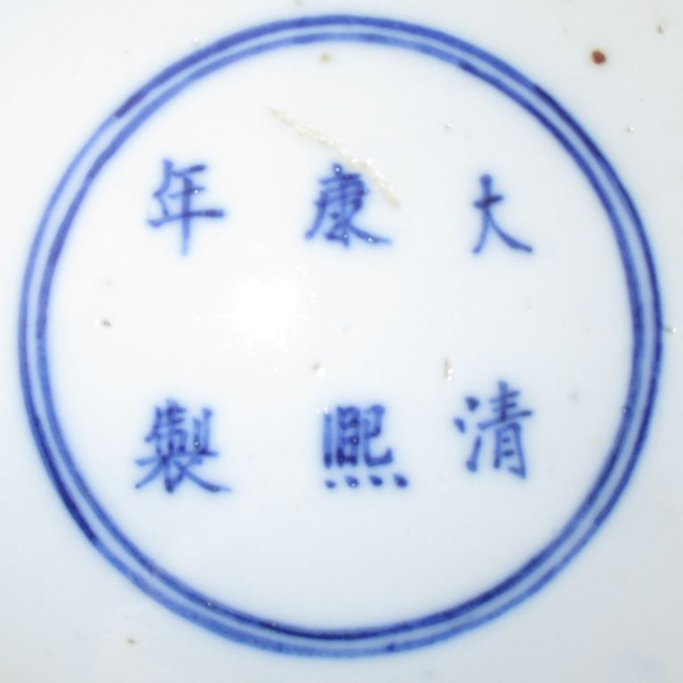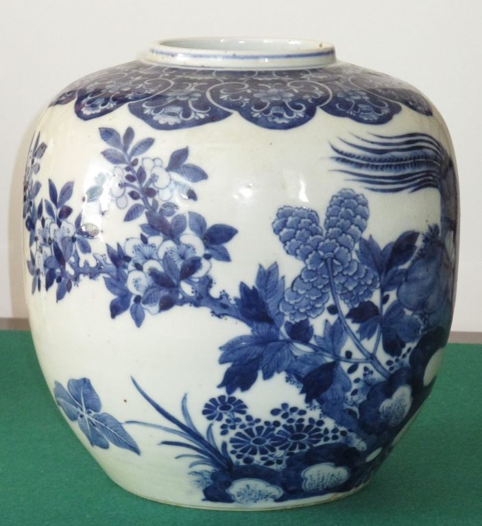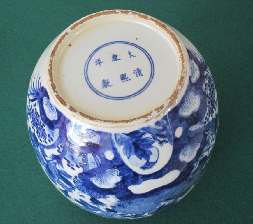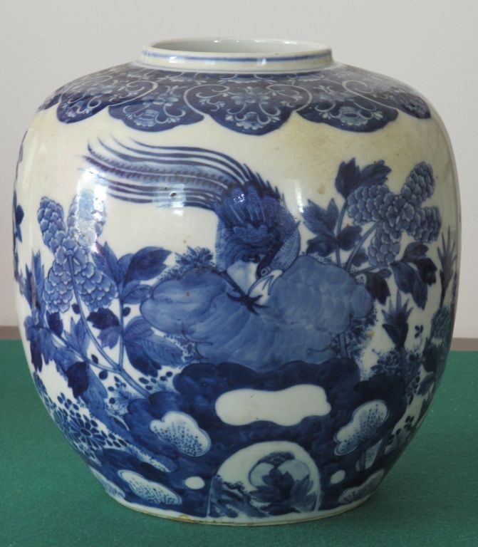 Vase à large panse et petit col, en porcelaine bleu-blanc, à décor d'un oiseau Fo Hang parmi rochers et fleurs, l'épaule ornée de têtes de ruyi stylisées. Marque apocryphe Kangxi sur la base. Chine, XIXème siècle. H. 25 cm. (Couvercle et socle en bois, rapportés)