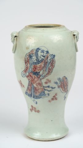 Vase balustre en porcelaine, à décor de personnage, Liuhaï avec le crapaud à trois pattes, sur fond blanc. Chine, dynastie Qing, XIX ème siècle. H. 20 cm (Col rodé)