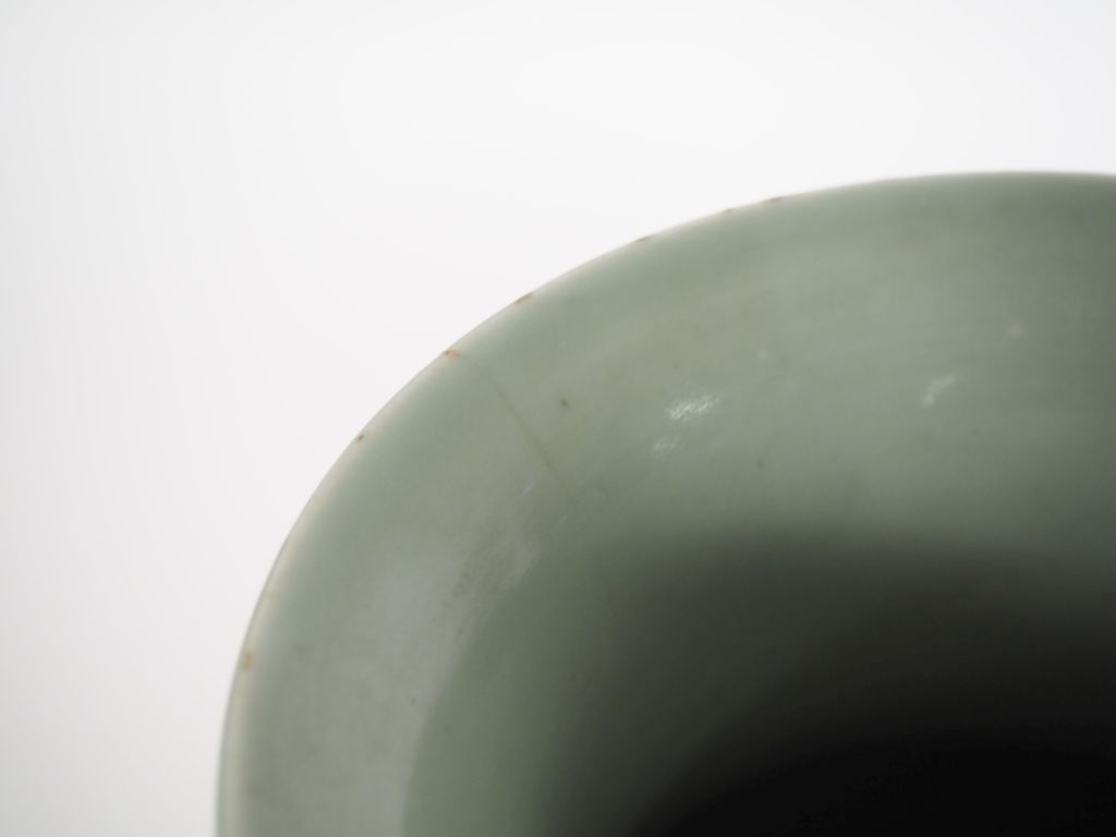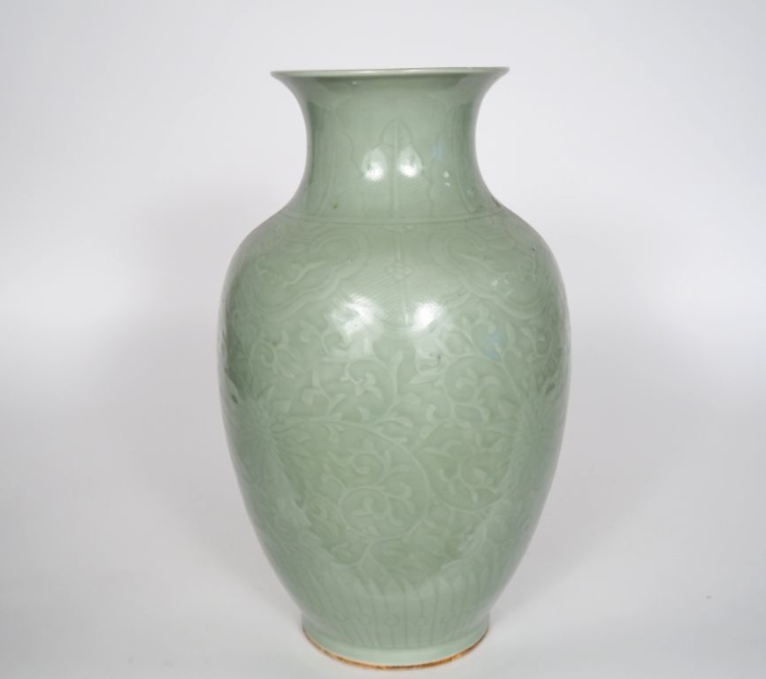 Vase balustre en porcelaine émaillée céladon à décor moulé sous couverte de fleurs de lotus et tiges feuillagées. Fêlé au col. H. 39 cm