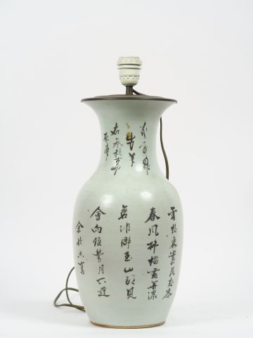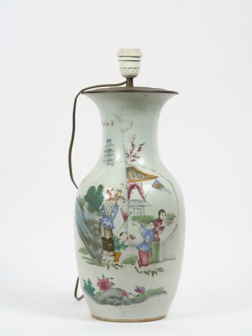 Vase balustre en porcelaine famille rose, monté en lampe , à décor d'une scène de famille aux abords d'un pavillon. Chine vers 1900. H. 42 cm