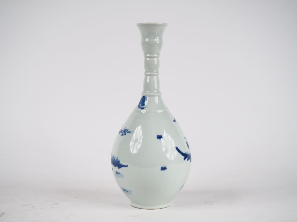Vase bouteille à col annelé en porcelaine bleu blanc décor d'une jeune femme accompagnée d'enfant marque apocryphe Chine milieu du XIXème H. 30 cm