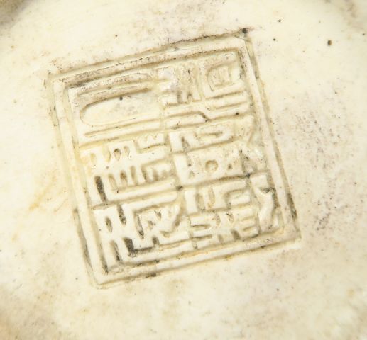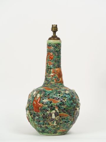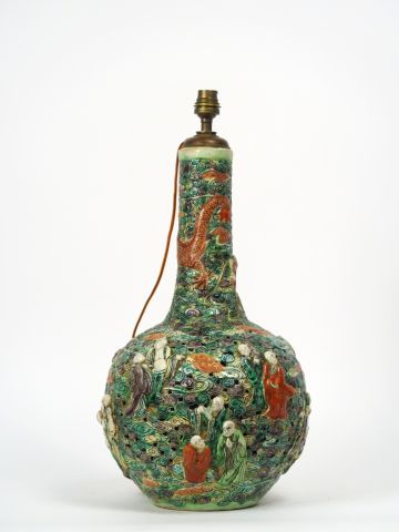 Vase bouteille à long col en porcelaine de style famille verte, décor de nuages ajouré sur lequel repose les dix huit lohangs. marque apocryphe H. 43,5 cm