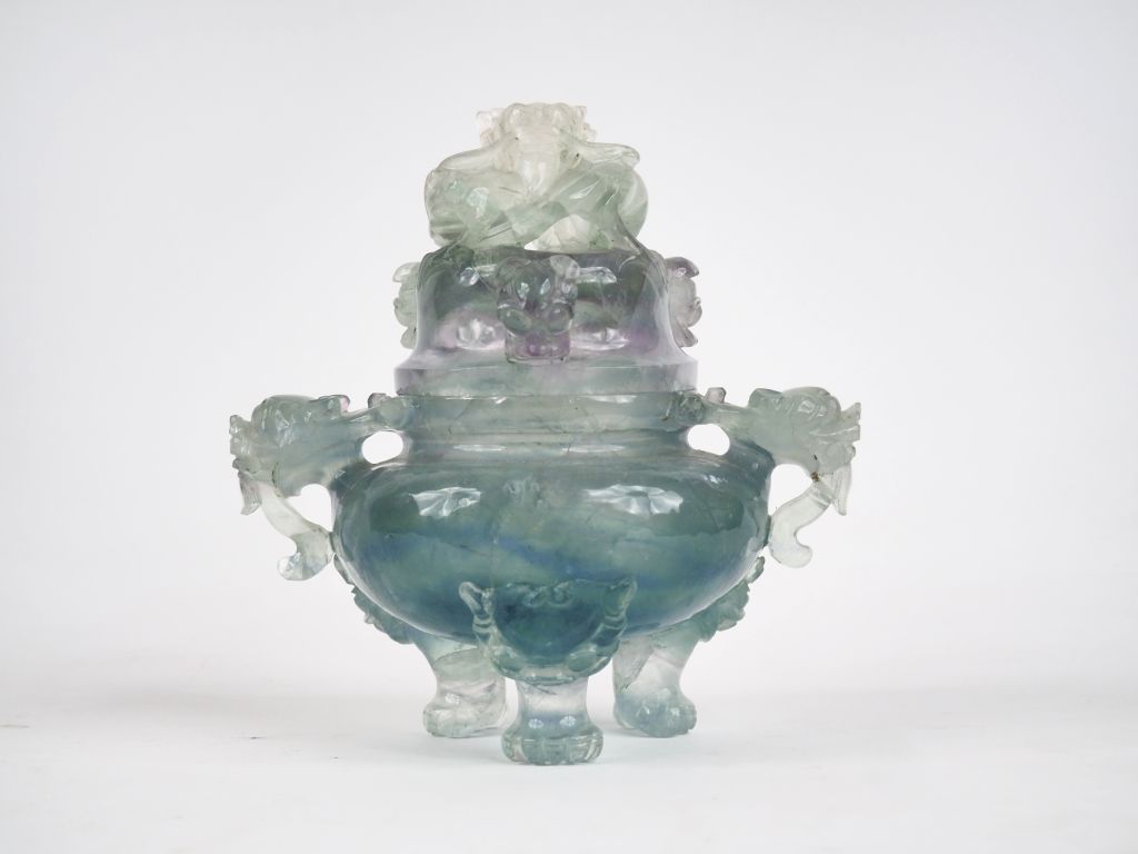 Vase couvert tripode en fluor à décor de dragons Chine vers 1960 H. 16 cm
