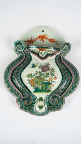 Vase d'applique en porcelaine aux émaux de famille verte à décor de bouquets de fleurs. Chine, vers 1920. H. 23 cm
