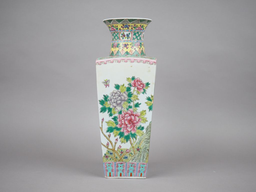 Vase de forme quadrangulaire en porcelaine et émaux dans le style de la famille rose, à décor de pivoiniers en fleurs et pétales de lotus stylisés. Chine, vers 1980. H. 42 cm