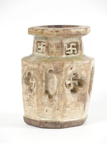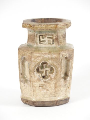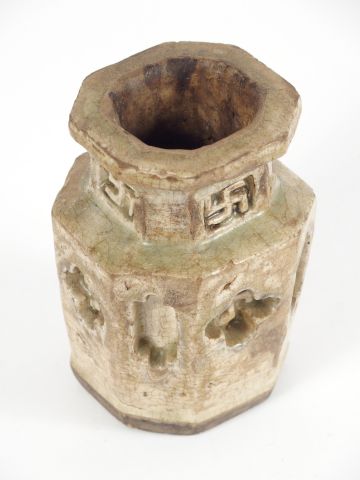 Vase en céramique et émail céladon de forme ortogonale, décor de svastika. Chine, période Ming. H. : 13,5 cm