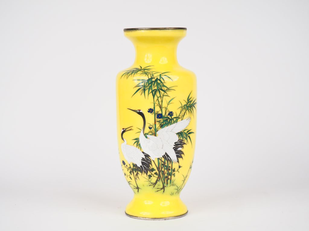 Vase ovoïde 1900 sur piedouche en opaline à décor de grues et de végétation sur fond jaune. H. 30.5 cm