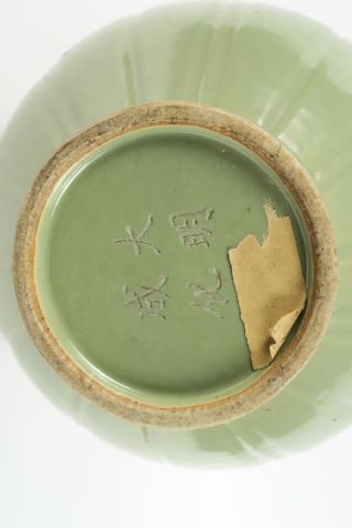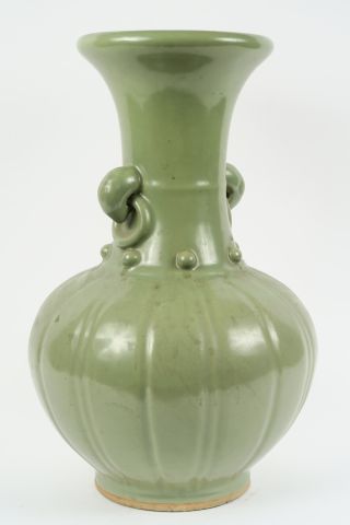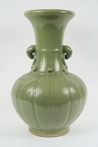 Vase ovoïde cotelé à haut col évasé en grès porcelaineux émaillé céladon Longqan. Marque apocryphe Yongle au revers. Chine, dynastie Qing, période Kangxi, XVII ème siècle. H. 40 cm