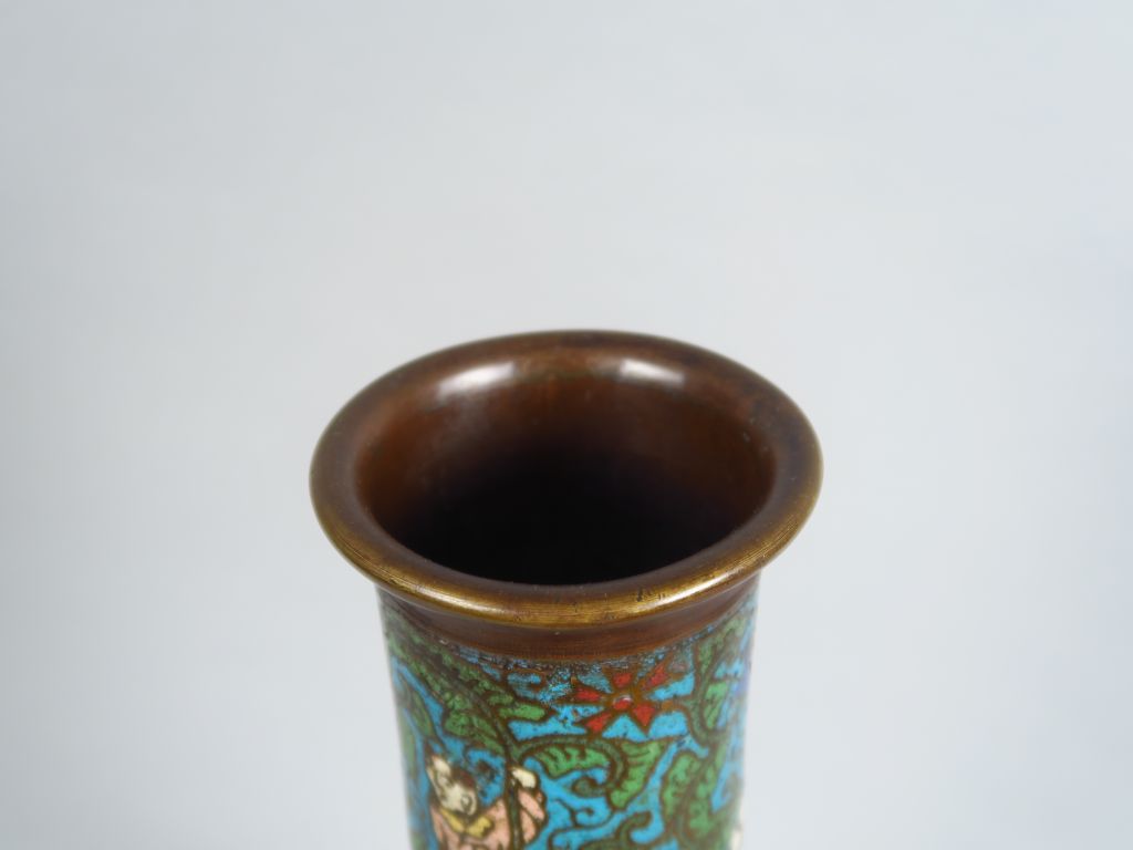 Vase pansu à long col en bronze, décor en émaux champlevés polychromes, à décor de personnages et de phoénix évoluant parmi des fleurs et rinceaux feuillagés. Japon, vers 1900. H. 52,5 cm