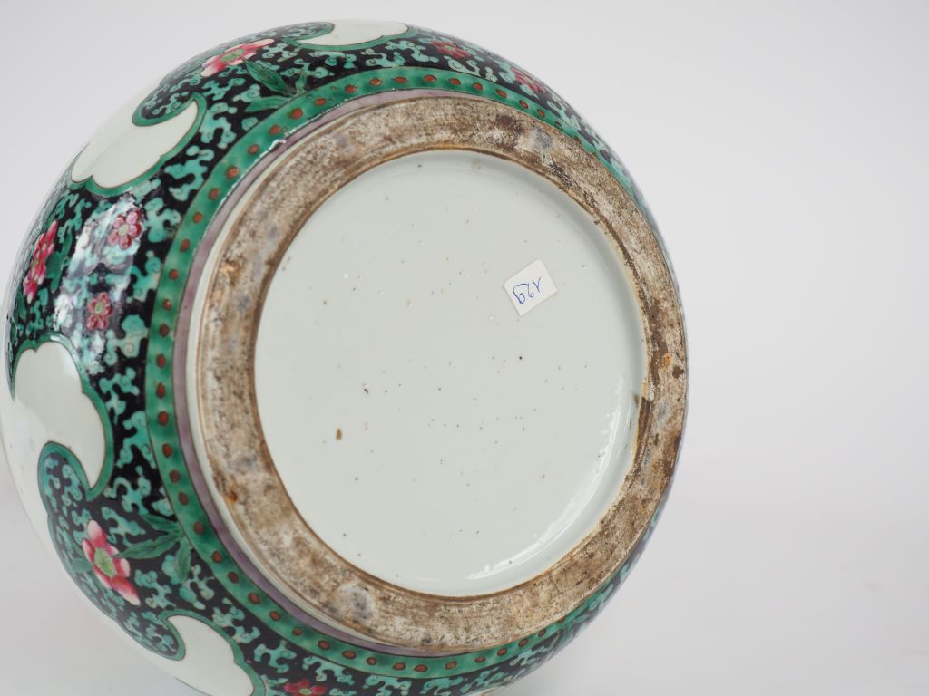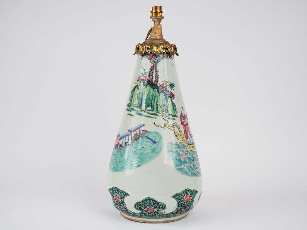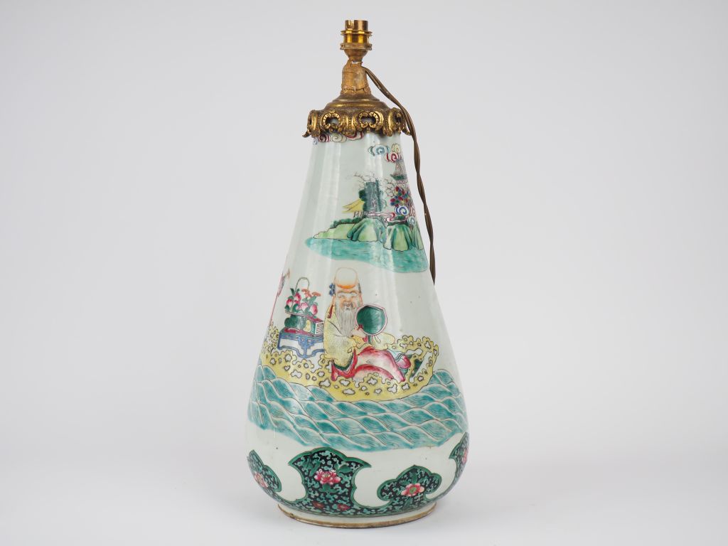 Vase piriforme en porcelaine de la famille rose, décor de zhoulao accompagné d'un disciple portant des pêches de longévité déscendant un fleuve sur une racine, un santon et un pagodon complètent le décor . Chine XVIIIème siècle. H. 40,5 cm. (col rodé)