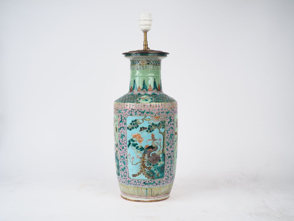 Vase rouleau en porcelaine et émaux famille rose sur un fond vert et turquoise, à décor d'oiseaux, de pivoiniers, de lotus, de chrysanthèmes et de prunus. Chine deuxième moitié XIXème H. 43 cm (fond perçé)