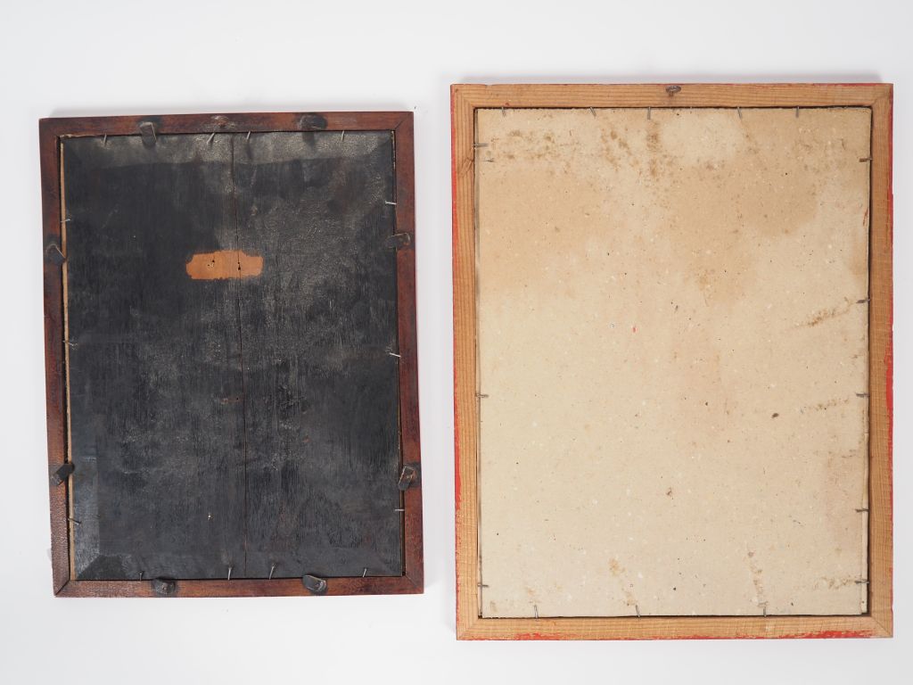Vietnam et Chine, XXe siècle, Deux encres et couleurs sur papier, dont un portrait de femme (signé en bas à droite) et un Maitreya représenté assis tenant une coupe de fleur de lotus (signé en bas à gauche Jing Bai). Usures, taches. Dim. 33 x 25 cm et 32 x 25 cm