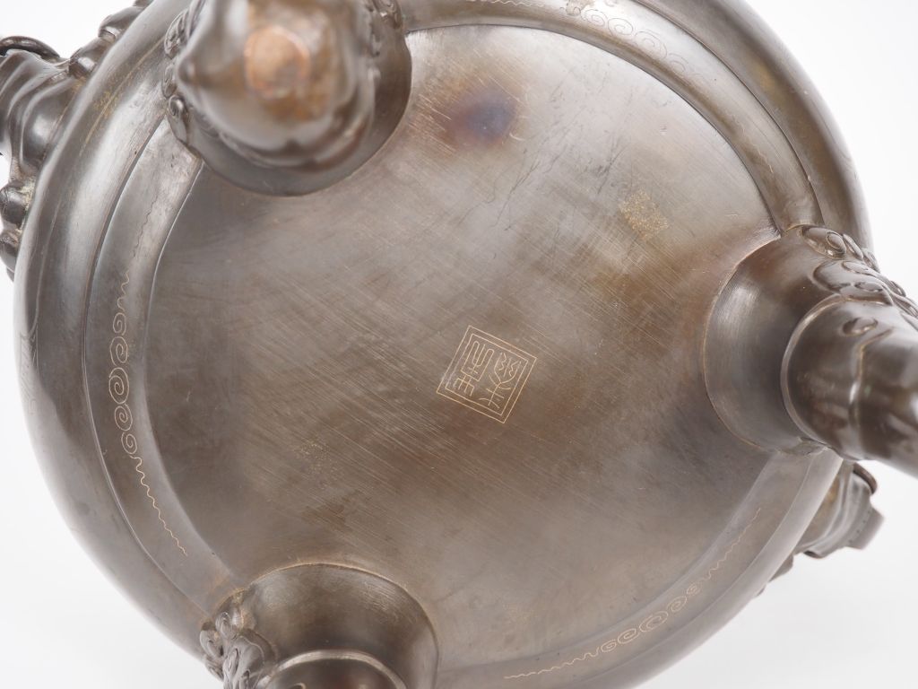 Vietnam, fin XIXe siècle Garniture comprenant, un brûle-parfum reposant sur trois pieds crachés par des têtes de dragons, orné de deux anses en forme de sceptres ruyi émergeant de têtes de dragons, à décor niellé de scènes de processions relatant l’arrivée d’un dignitaire et de sa suite, et motifs floraux, reposant sur un socle circulaire, la prise du couvercle formée par un lion : et deux vases de forme Lancel à décor similaire. H. 47,5 cm – 36 cm (Petits chocs)