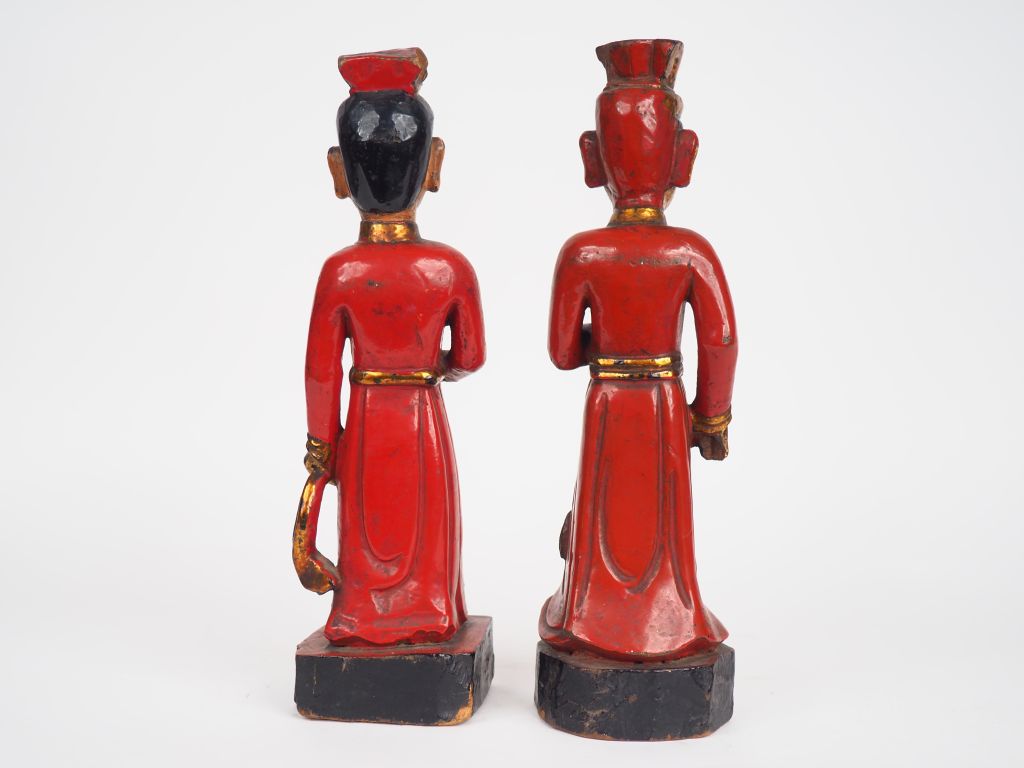 Vietnam, fin XIXe siècle, Paire d’adorants en bois laqué noir, rouge et rehauts d’or tenant des offrandes. H.39,5 cm.