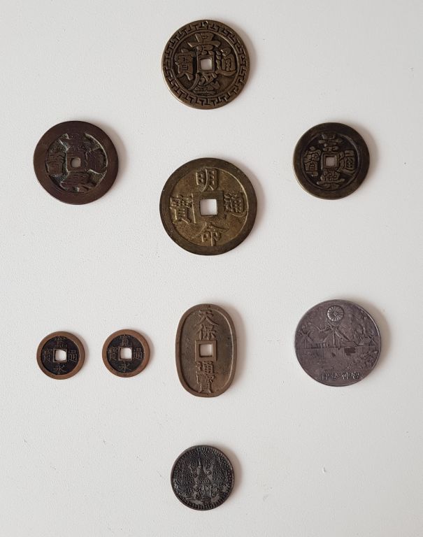 Vietnam, Japon et Thailande : Lot de neuf pièces en alliages de cuivre divers comprenant : . Vietnam : quatre pièces percées d’un carré, trois marquées Canh Hung (une formant pendentif) , une marquée Minh Mang . Japon : deux petites pièces Mon marquées Kanei Tsûhô , une pièce oblonque Tenpô tsûhô , une pièce commémorative du sanctuaire d’Ise, datée Showa 48 (1973). . Thailande : une pièce. Diam. 2,5 cm à 5 cm.