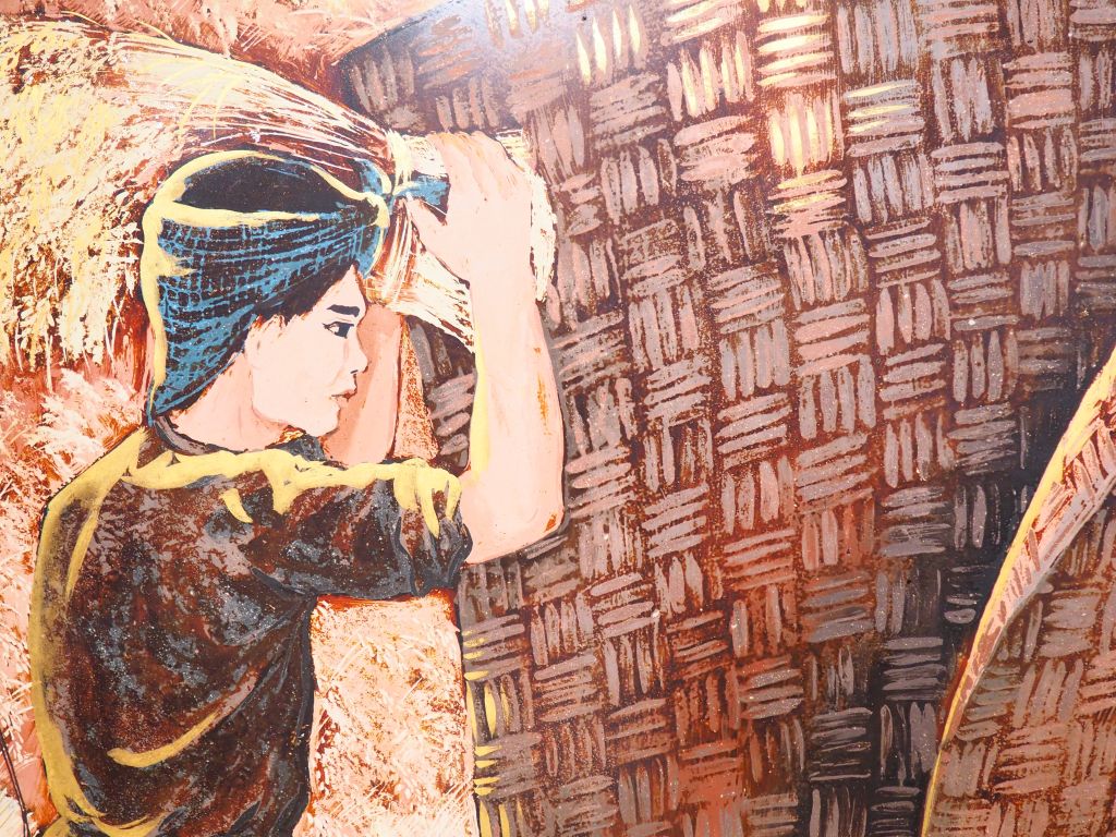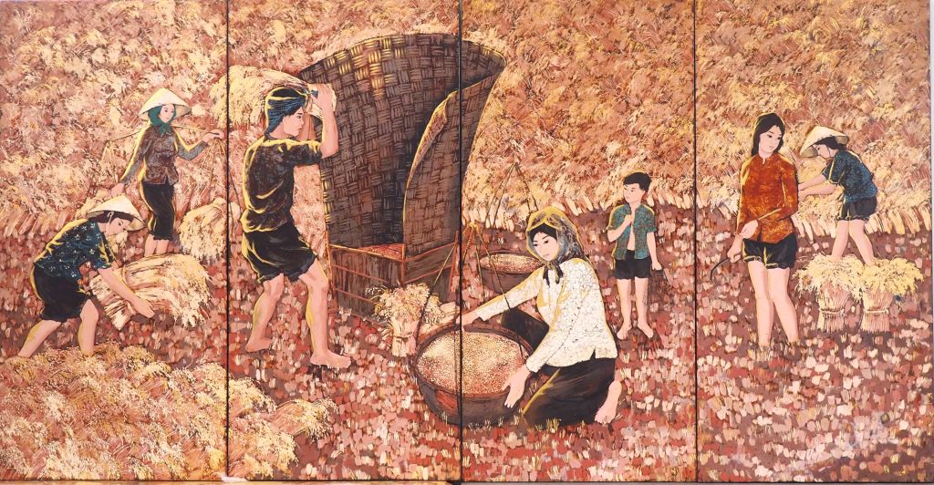 Vietnam, seconde moitié XXe siècle, Important panneau en laque polychrome et doré monté en paravent à quatre feuilles représentant des jeunes femmes et enfant dans les champs. Signature en bas à droite illisible. Dim. 140 x 200 cm