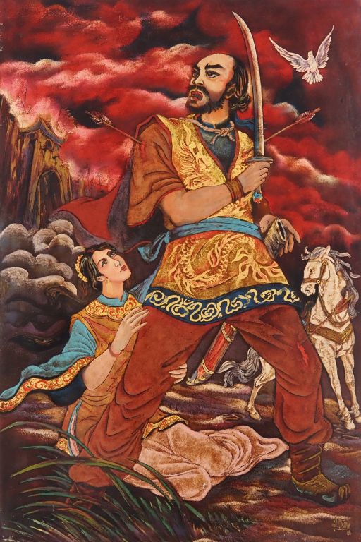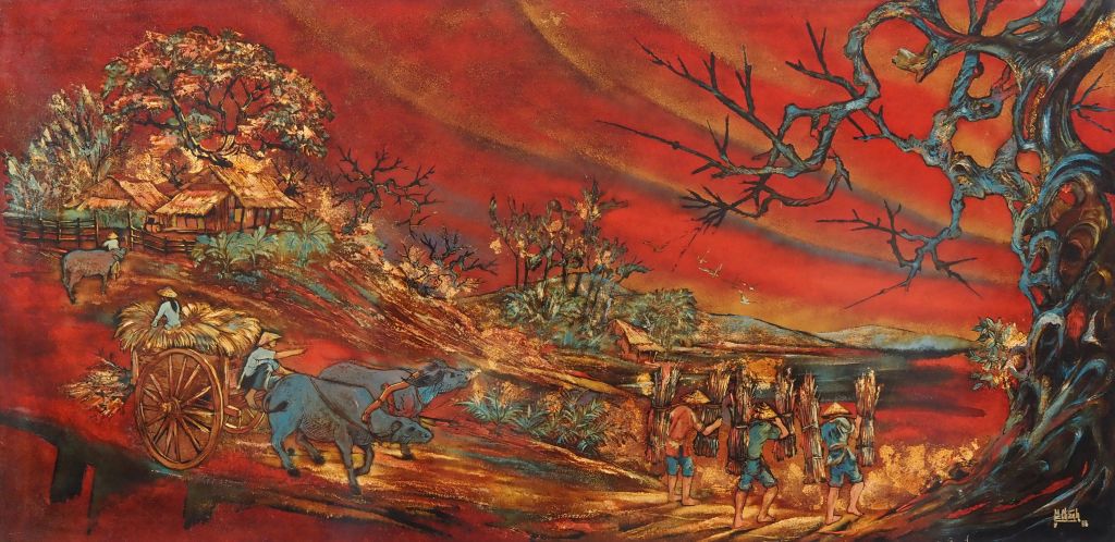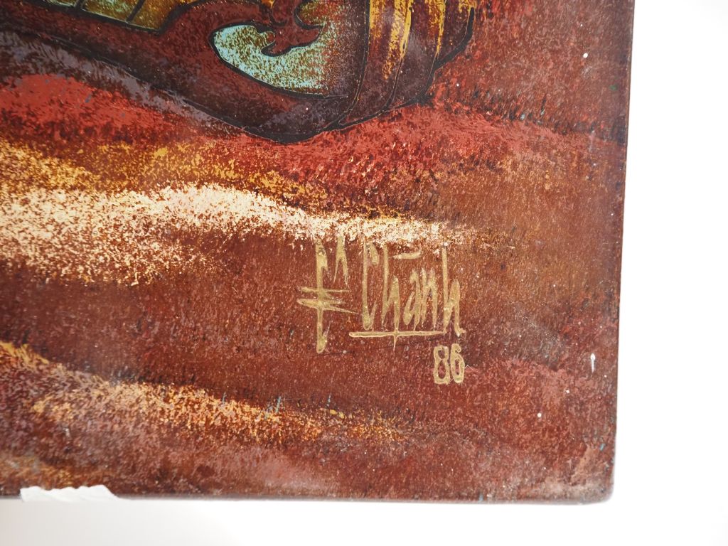 Vietnam, travail moderne, Deux panneaux en laque, représentant un guerrier blessé et retour des paysans accompagnés de leurs buffles. Signés Chanh Lê. 86. Dim. 91 x 60 cm Dim. 60 x 120 cm